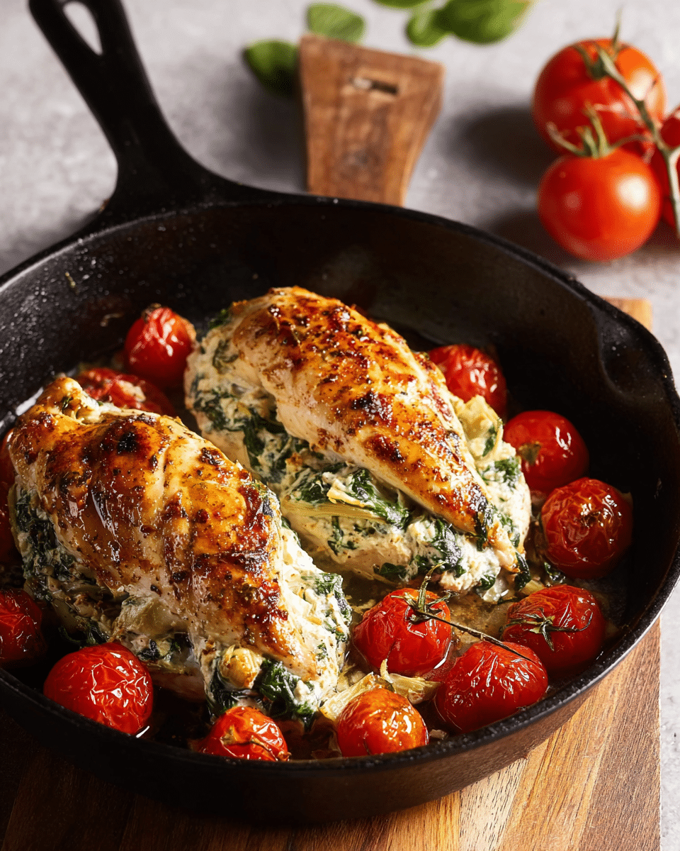 This Spinach Artichoke Stuffed Chicken with Blistered Tomatoes is proof that weeknight dinners don’t have to be boring. It’s creamy, savory, tangy, and ready in just half an hour. Perfect for impressing guests, feeding the family, or treating yourself to something a little special.
